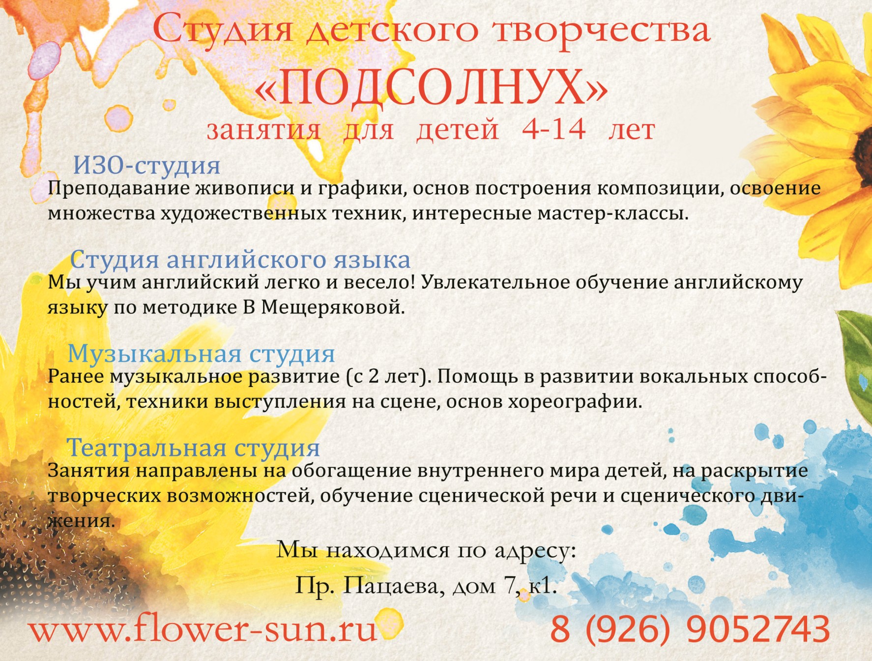 Творческая мастерская "Подсолнух" приглашает: - детей 3-12 лет на занятия в изостудию, тел.: 8-926-905-27-43;